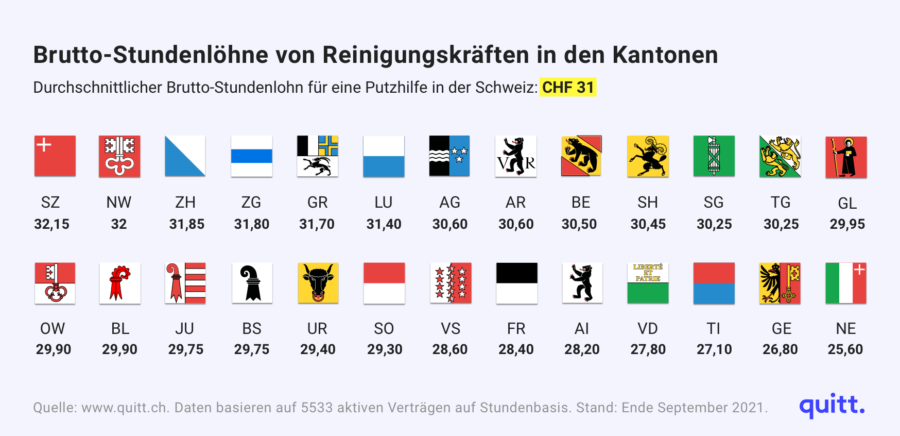 Auch in der Schweiz gibt es regionale Unterschiede bei der Entlohnung von Putzhilfen, wobei diese im Vergleich zu anderen Ländern nicht ganz so gross ausfallen. Unsere Infografik zeigt die kantonalen Unterschiede beim durchschnittlichen Stundenlohn auf quitt..Reinigungskräfte verdienen im Durchschnitt 31 Franken pro Stunde in der Schweiz. Doch je nach Kanton unterscheiden sich die Löhne stark.