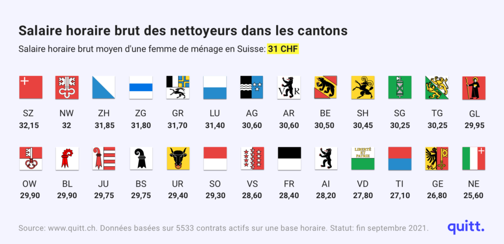 La plate-forme en ligne quitt. gère la paie de plus de 20 000 aides ménagères en Suisse et connaît donc le salaire horaire moyen que M. et Mme Suisse paient à leur personnel de nettoyage privé.
