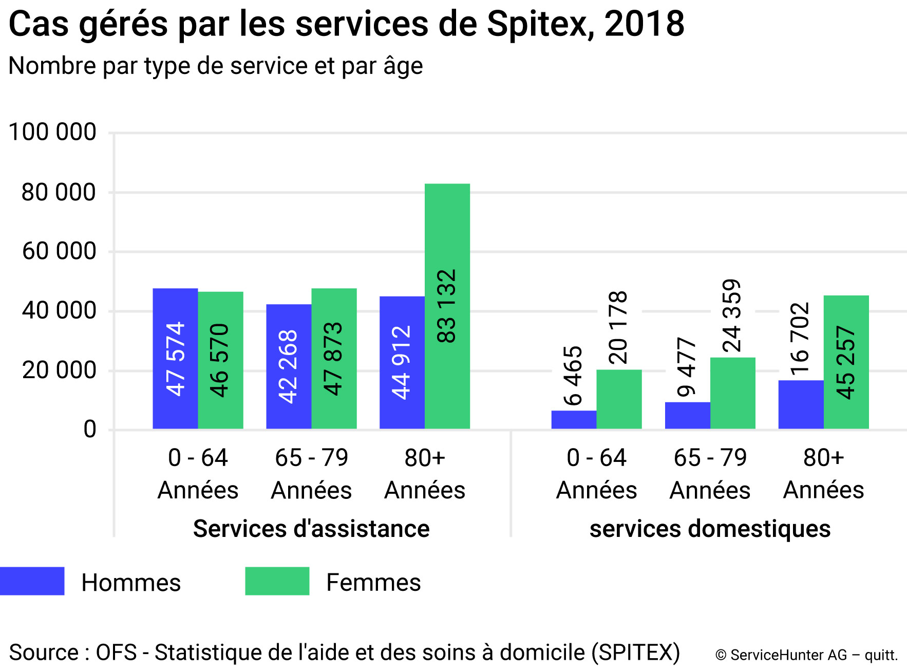 Selon l’Office fédéral de la statistique, 395 000 personnes en Suisse bénéficiaient d’un soutien à domicile par des organisations Spitex à la fin de l’année 2019. Ils fournissent des services de soins infirmiers et de santé à domicile, une aide au ménage, des conseils sociaux et de la compagnie. Environ 5 % de la population suisse totale utilise les services de Spitex. Sur 100 personnes âgées de 80 ans et plus, seules 15 séjournaient dans une maison de retraite et de soins fin 2019. 29 personnes ont reçu des soins et un soutien à domicile.