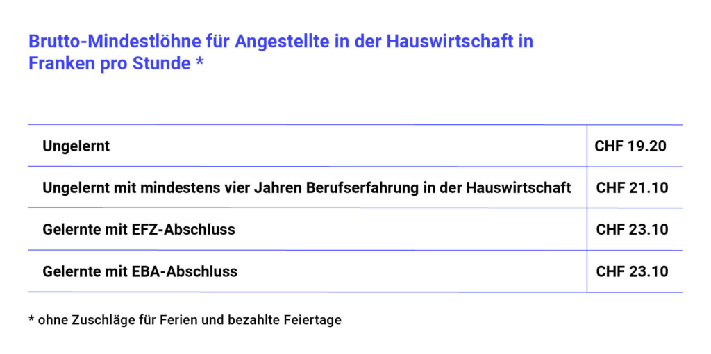 Quelle: Verordnung über den Normalarbeitsvertrag für ArbeitnehmerInnen und Arbeitnehmer in der Hauswirtschaft, Stand: Januar 2020. Diese Verordnung gilt bis Ende 2022.